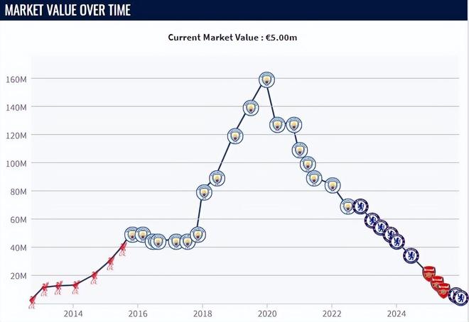 近几年的低迷表现,也让斯特林的身价直线下滑,在比较权威的身价网站《德国转会市场》的最新统计中,斯特林的最新身价已经跌至500万欧元。要知道在斯特林的巅峰期,身价可是达到过1.6亿欧元,那时的他就是最顶级的球员之一,整个世界足坛身价比他更高的球员只有姆巴佩和内马尔。但是在短短6年后,他的身价就足足缩水了32倍,从万人追捧的明星,变成了无球可踢的弃子。